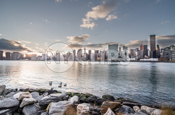 ducks in East River - view from Brooklyn with rocks in foreground and Manhattan skyline in background at sunset in early evening