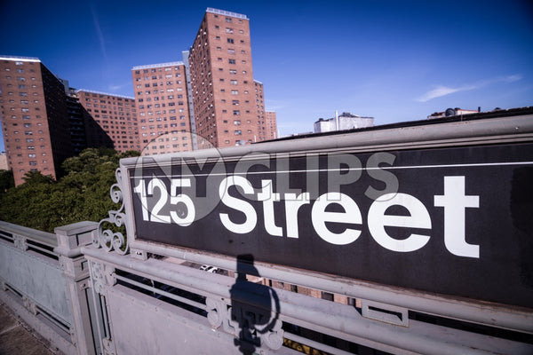 125th street subway sign in Harlem with housing projects in background in Uptown Manhattan NYC