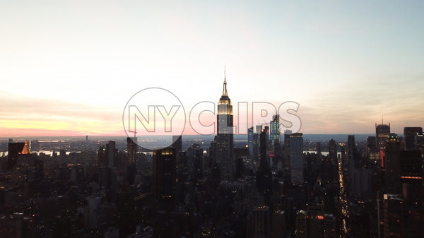 Empire State Building aerial in early evening sunset - Manhattan buildings silhouette in New York City NYC