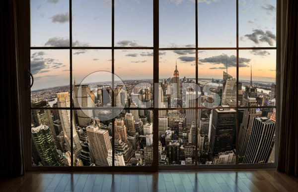Manhattan cityscape from window at sunset New York City