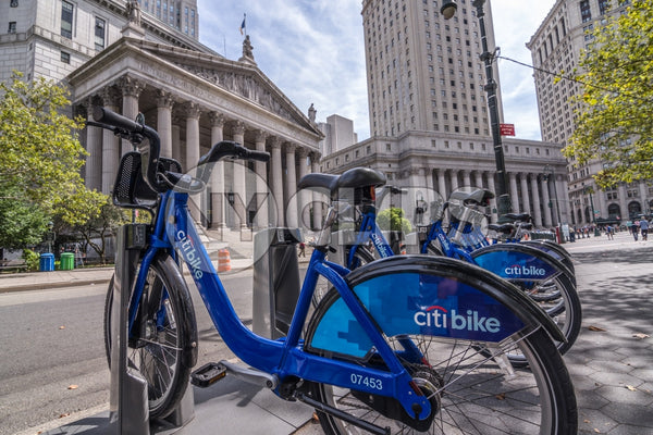 Citi Bikes parked at docking station downtown outside courthouse in Manhattan