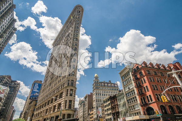 flatiron, flat-iron, flat iron, building, famous, odd, shape, shaped, skyscraper, landmark, 5th ave, 5th avenue, blue sky, summer, day, daytime, clouds, bright, sunny