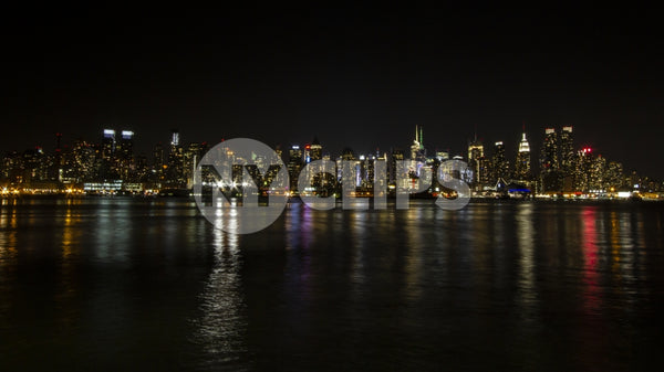 Manhattan skyline at night with reflections off water New York City NYC