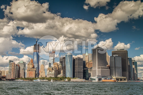 skyscrapers in Downtown Manhattan with Freedom Tower unfinished across East River on beautiful day