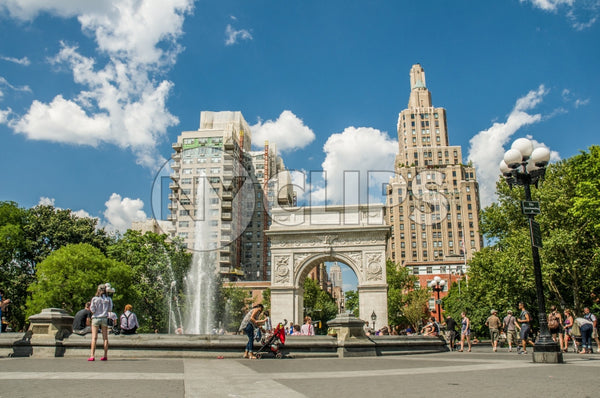 washington square park, washington square, park, summer, blue sky, clouds, arch, monument, landmark, people, fountain, spraying